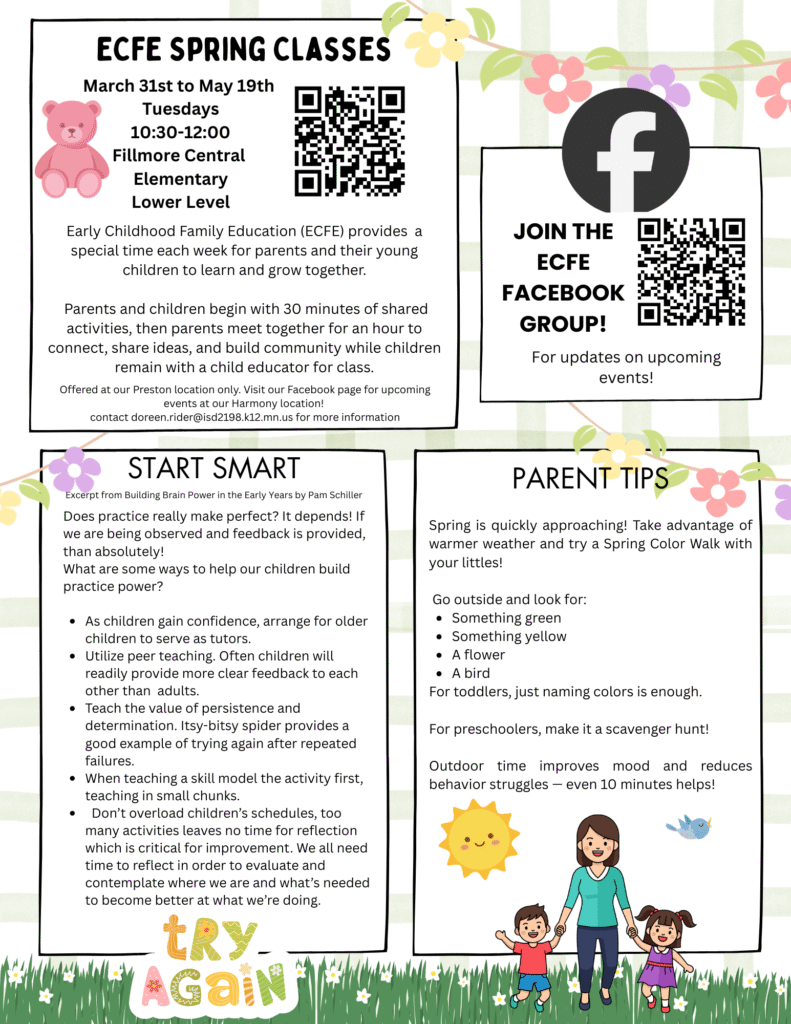 A community education program specifically designed for families with children ages birth to kindergarten. Families meet once a week for eight week sessions with the following activities: